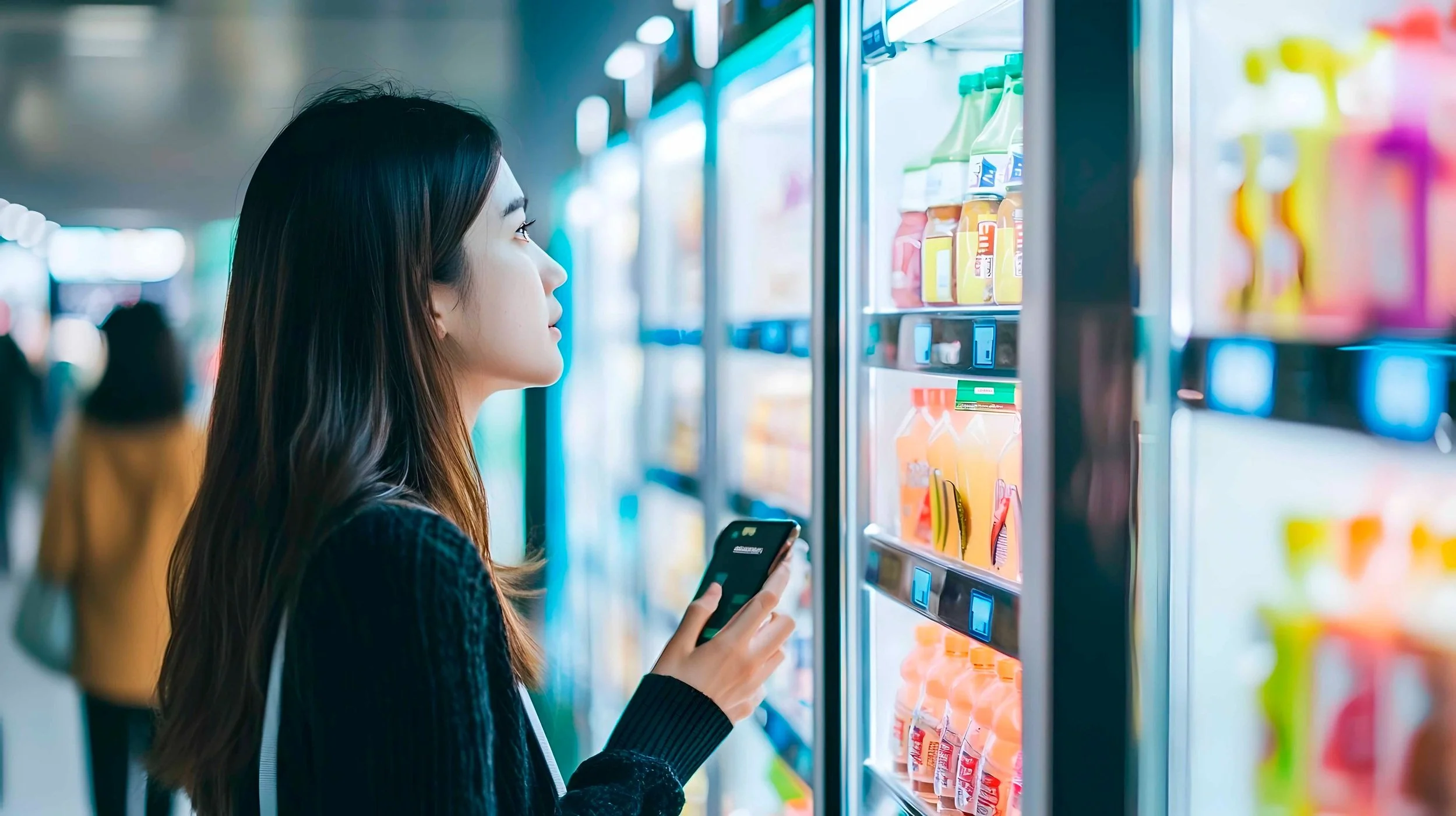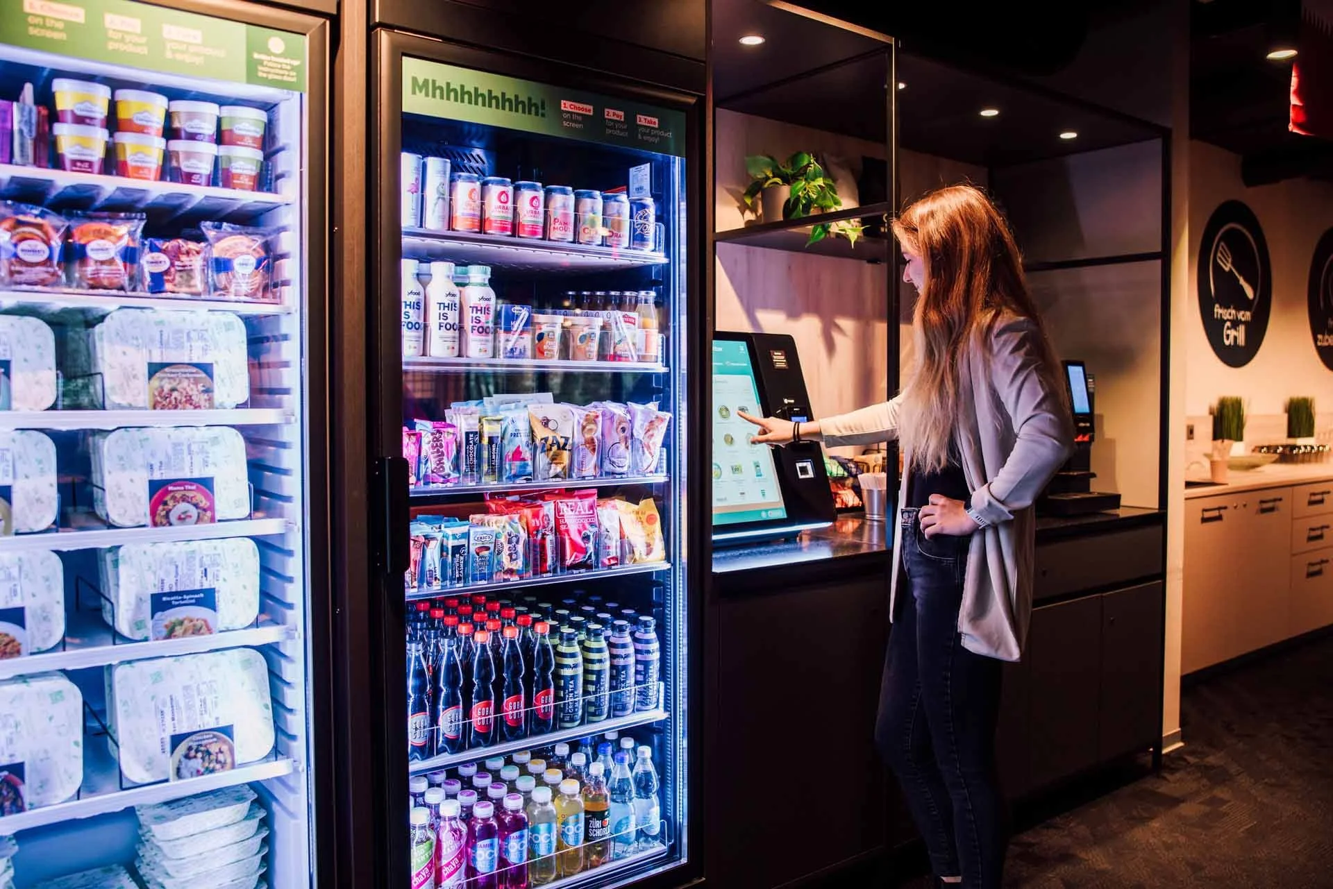 Esta autenticación segura desbloquea la puerta, dando acceso a una amplia selección de productos que van desde aperitivos y bebidas hasta comidas frescas y listas para consumir.
